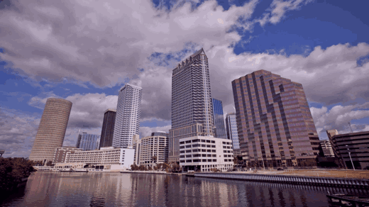 Looping drone video of the Tampa Bay skyline, with an aerial view of downtown buildings along the waterfront and the open bay.